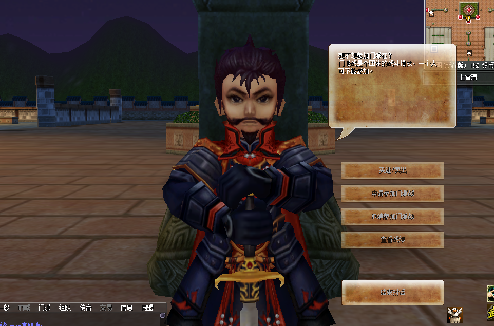 1:移动至银币广场,去NPC上官清,申请参加宗门战(帮战)