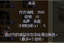 ![]() 学习等级:10级 需要内功/mp:2000 传染异常技能详情: ![]() 学习等级:10级 需要内功/mp:3500 阎王爆+传染使用详情: ![]() 第一步:先放阎王爆,然后再放传染技能,就可以传染3~5+的怪物身上。 第二步:然后用群攻技能去群怪物,从放阎王爆/传染技能开始,累计技能伤害值。然后5~8秒爆炸! 例如:放了阎王爆+传染后,用技能打怪物伤害2000点,连续放第二次技能是2000点,那么爆炸的一瞬间就是4000点伤害。 |